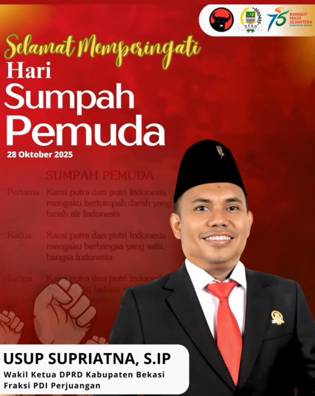 CIKARANG, MEDIASI.COM – Wakil Ketua DPRD Kabupaten Bekasi Fraksi PDI Perjuangan, Usup Supriatna mengajak pemuda berdiri tegap di atas kaki sendiri. Ajakan itu disampaikan pada peringatan Hari Sumpah Pemuda ke 97 di Sage Pancong Lumer Jln Mega Raya Blok D No 7 Desa Sukaragam, Kecamatan Serang Baru, Kabupaten Bekasi, Selasa (28/10/2025) malam.