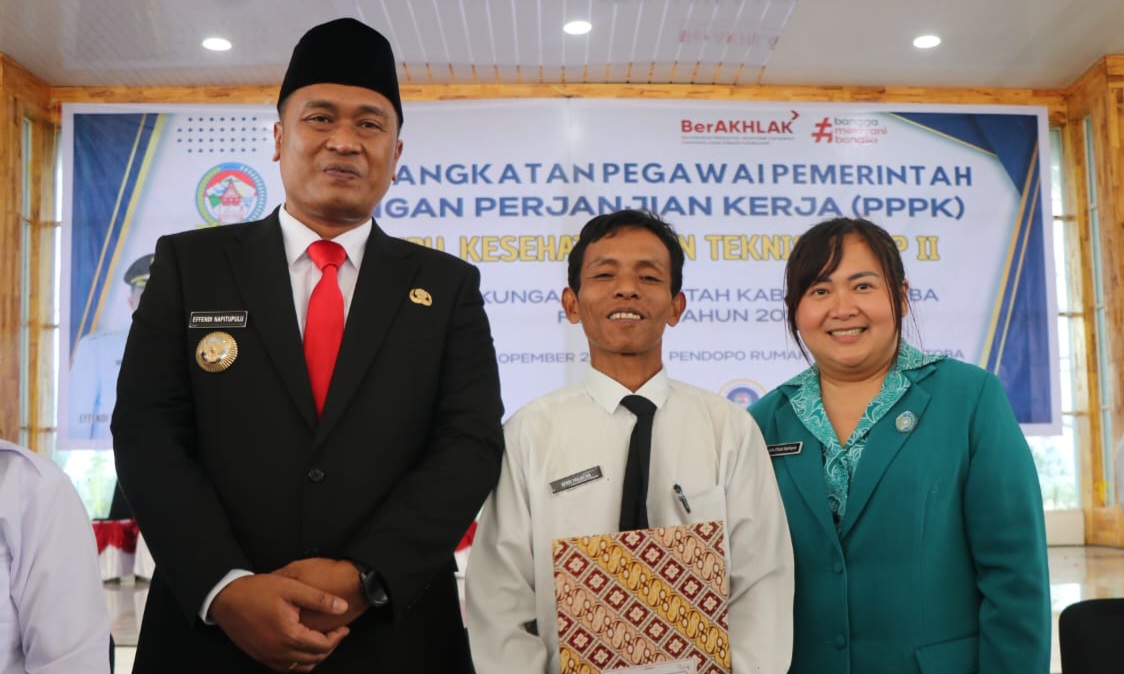 BALIGE, MEDIASI.COM – Bupati Toba Effendi Sintong P. Napitupulu bersama Wakil Bupati Toba Audi Murphy O. Sitorus, Ketua DPRD Toba Franshendrik Tambunan, Pj. Sekda Toba Paber Napitupulu, Ketua TP. PKK Kabupaten Toba Ny. Astita Effendi Sintong Napitupulu dan Kepala Bank Sumut Cabang Balige menyerahkan SK PPPK (Pegawai Pemerintah dengan Perjanjian Kerja) Guru, Kesehatan dan Teknis Tahap II di Lingkungan Pemerintah Kabupaten Toba Formasi 2024 di pendopo rumah dinas Bupati Toba, Senin (10/11/2025).