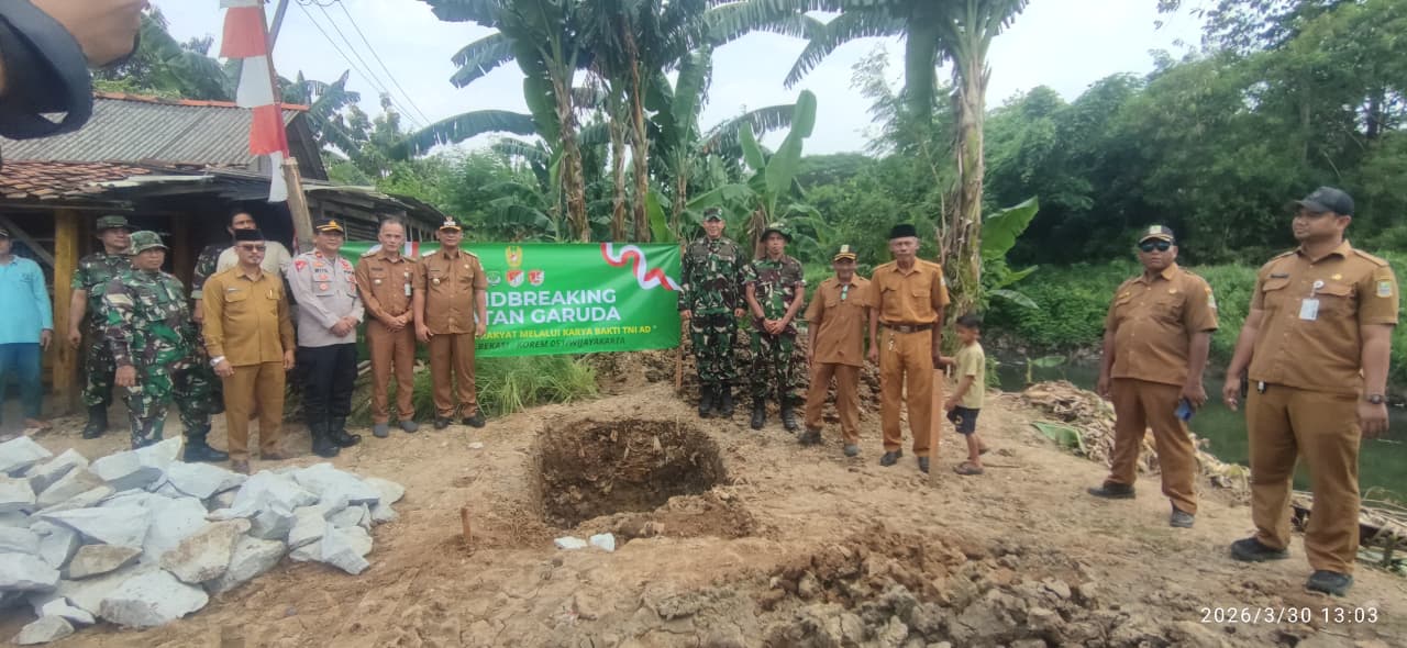 GROUND BREAKING : Pelaksana Tugas (Plt) Bupati Bekasi, Asep Surya Atmaja, bersama Dandim 0509/Kabupaten Bekasi, Michael Ronald Simbolon, melakukan peletakan batu pertama pembangunan Jembatan Garuda di Desa Kedungjaya, Kecamatan Babelan, Senin (30/3/2026).