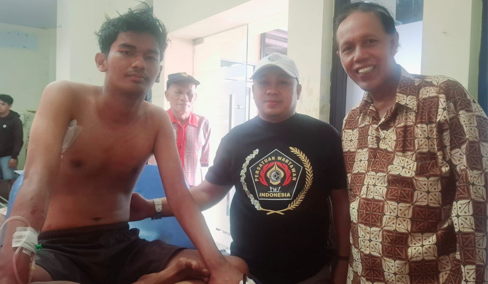 Korban Mario Stefanus Manalu saat dijenguk Ade Muksin, SH, Ketua PWI Bekasi Raya